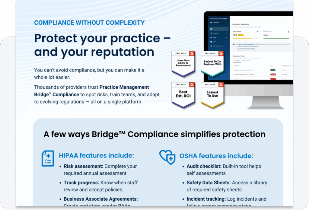 Bridge Compliance is software trusted by more than 5,000 practices to manage HIPAA and OSHA requirements. The platform uncovers gaps, provides team training, and adapts to evolving regulations to keep staff, patients, and data safe.